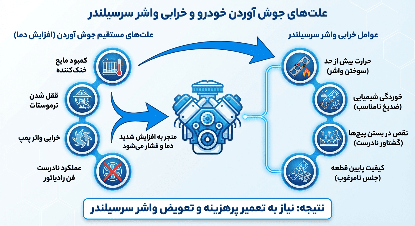 ۱. اصلی‌ ترین علت جوش آوردن ماشین و سوختن واشر سرسیلندر چیست؟